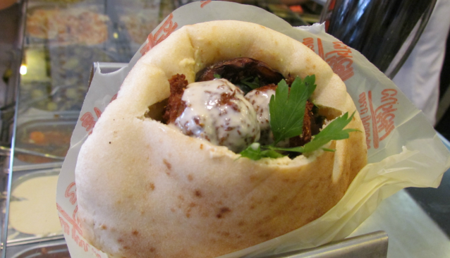 off of the spit and served in a fresh pita with vegetables, hummus, and